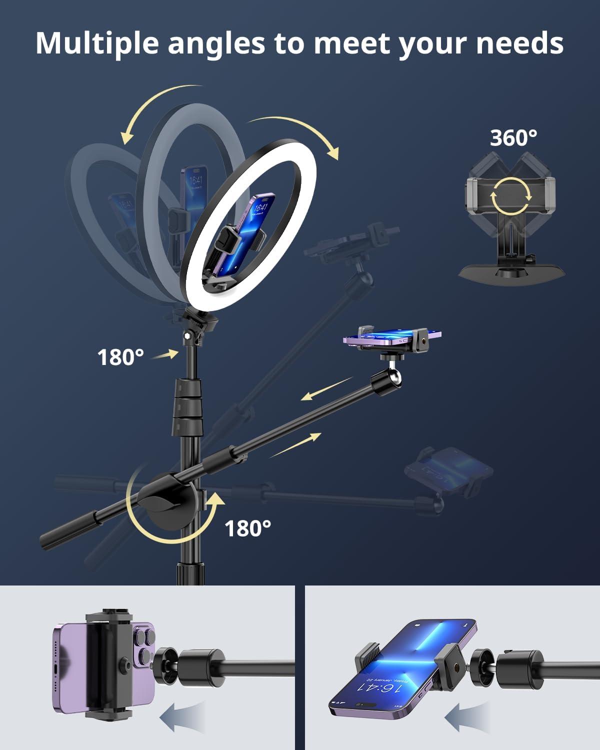 【Ultimate Creator Toolkit】This top-mounted ring light tripod effortlessly converts into a full 75-inch standing setup in just seconds. The phone holder is compatible with iPhones and Android devices, including Pro Max to SE models, while the extendable arm supports webcams and small cameras with ease